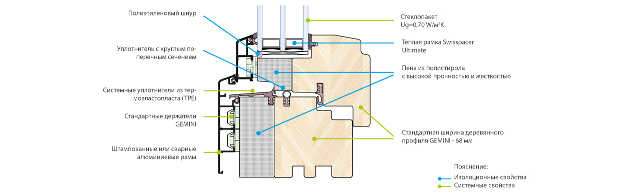Gemini PassivСистема Gemini Passiv используется для дерево-алюминиевых светопрозрачных конструкций в энергоэффективных домах. Система имеет отличную термоизоляцию, высокую герметичность, повышенную устойчивость к ветровым нагрузкам, сохраняя при этом нужную воздухопроницаемость. Используется для остекления помещений с высокими требованиями к энергосбережению и эксплуатации. Gemini Passiv имеет коэффициент теплопроводности ≤ 0,80 Вт/(м2K) в сочетании с тройным стеклопакетом с коэффициентом теплопроводности = 0,7 Вт/м2K. Сертификат института Passivhaus Institut подтверждает соответствие данной системы требованиям для энергосберегающего дома. Изоляционный материал с высокой прочностью, который используется в системе, изготовлен на основе вспененного полистирола, по параметрам этот инновационный материал сравним с древесиной. Системные держатели Gemini крепятся сразу к этому жесткому и прочному материалу. Особенности системы – это дополнительные элементы, которых нет в привычных дерево-алюминиевых конструкциях: используется теплая рамка типа Swisspacer Ultimate, широкий основной уплотнитель, полиэтиленовый шнур и дополнительный средний уплотнитель. Доступные конструкции